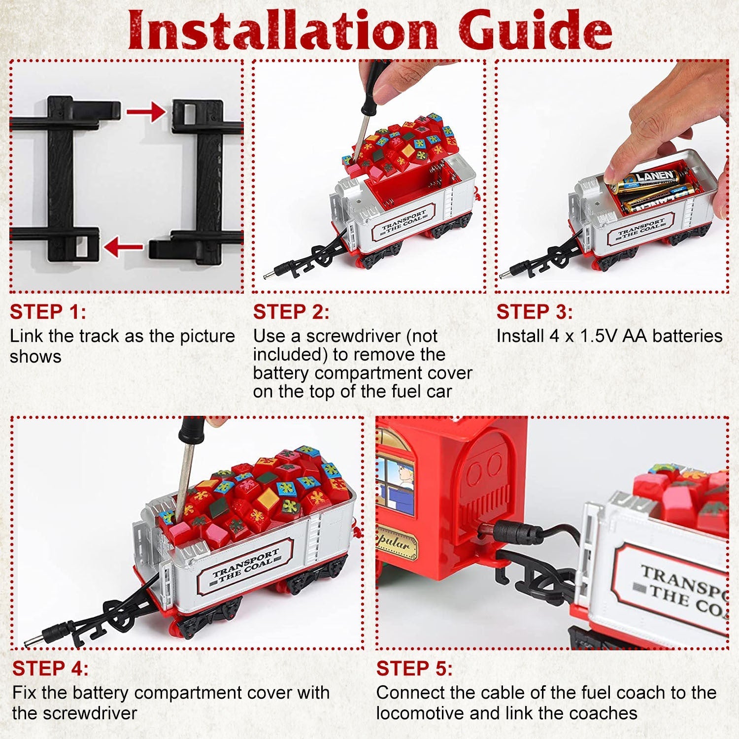 - *Realistic Music And Light*: When running around on the track,this Christmas train features realistic sounds of authentic engine sounds and locomotive’s horns,and a headlight that lights up. The realistic sounds and light can easily bring kids back to the age of steam,where there was no internet,no TV,no smartphones,and no air travel. Only trains undertook exchange of goods and industrial material.